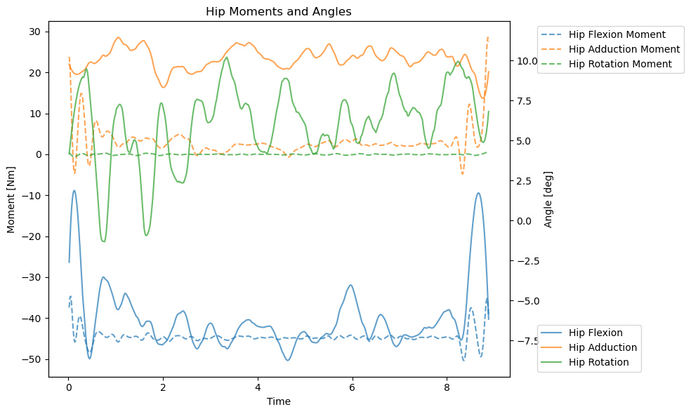 Here is an example of angle (full line) and moment/torque (dashed) data for right hip. They are further processed in motion processing script.