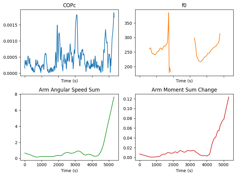desired_sr =0.5# this is the sr we are going to merge on (in Hz/sec)error_log = []forfilein bbfiles: bb_df = pd.read_csv(file)# get trial id trialid = bb_df['TrialID'][0]print('working on '+ trialid)# find the same trialid in idfiles id_file = [x for x in idfiles if trialid in x]try: id_df = pd.read_csv(id_file[0])exceptIndexError:print('IndexError: '+ trialid +' not found') errormessage ='IndexError: '+ trialid +' not found for ID' error_log.append(errormessage)continue# find the same trialid in mtfiles mt_file = [x for x in mtfiles if trialid in x]try: mt_df = pd.read_csv(mt_file[0])exceptIndexError:print('IndexError: '+ trialid +' not found') errormessage ='IndexError: '+ trialid +' not found for MT' error_log.append(errormessage)continue# rename Time to time mt_df.rename(columns={'Time': 'time'}, inplace=True)# find the same trialid in envfiles env_file = [x for x in envfiles if trialid in x]try: env_df = pd.read_csv(env_file[0])exceptIndexError:print('IndexError: '+ trialid +' not found') errormessage ='IndexError: '+ trialid +' not found for ENV' error_log.append(errormessage)continue# rename trialID to TrialID env_df.rename(columns={'trialID': 'TrialID'}, inplace=True)# find the same trialid in f0files f0_file = [x for x in f0files if trialid in x]try: f0_df = pd.read_csv(f0_file[0])exceptIndexError:print('IndexError: '+ trialid +' not found') errormessage ='IndexError: '+ trialid +' not found for F0' error_log.append(errormessage)continue# rename time_ms to time f0_df.rename(columns={'time_ms': 'time'}, inplace=True)# rename ID to TrialID f0_df.rename(columns={'ID': 'TrialID'}, inplace=True)# find the same trialid in ikfiles ik_file = [x for x in ikfiles if trialid in x]try: ik_df = pd.read_csv(ik_file[0])exceptIndexError:print('IndexError: '+ trialid +' not found') errormessage ='IndexError: '+ trialid +' not found for IK' error_log.append(errormessage)continue# find the same trialid in formants formants_file = [x for x in formants if trialid in x]try: formants_df = pd.read_csv(formants_file[0])exceptIndexError:print('IndexError: '+ trialid +'not found') errormessage ='IndexError: '+ trialid +' not found for formants' error_log.append(errormessage)continue# rename triald to TrialID formants_df.rename(columns={'trialid': 'TrialID'}, inplace=True) formants_df = formants_df[['time', 'f1', 'f2', 'f3', 'TrialID']] formants_df['time'] = formants_df['time'] *1000# find the same triaalid in CoG sc_file = [x for x in scfiles if trialid in x]try: sc_df = pd.read_csv(sc_file[0])exceptIndexError:print('IndexError: '+ trialid +'not found') errormessage ='IndexError: '+ trialid +' not found for CoG' error_log.append(errormessage)continue# write error logwithopen(TSmerged +'/error_log.txt', 'w') as f:for item in error_log: f.write("%s\n"% item)############## MERGING ############################ regularize sr in bb time_new = np.arange(0, max(bb_df['time']), 1/desired_sr) bb_interp = pd.DataFrame({'time': time_new})# interpolate all columns in samplebb colstoint = bb_df.columns colstoint = [x for x in colstoint if'time'notin x] colstoint = [x for x in colstoint if'TrialID'notin x] colstoint = [x for x in colstoint if'FileInfo'notin x]for col in colstoint: bb_interp[col] = bb_df[col].interpolate(method='linear', x = bb_interp['time'])# add trialid and time bb_interp['TrialID'] = trialid bb_interp['FileInfo'] = bb_df['FileInfo'][0]########### merge the bb_interp with env# merge the two dataframes merge1 = pd.merge(bb_interp, env_df, on=['time', 'TrialID'], how='outer')# interpolate missing values of envelope and audio colstoint = merge1.columns colstoint = [x for x in colstoint if'audio'in x or'envelope'in x]for col in colstoint: merge1[col] = merge1[col].interpolate(method='linear', x = merge1['time'])# now we can kick out all values where COPc is NaN merge1 = merge1[~np.isnan(merge1['COPc'])]########### merge with ID# merge the two dataframes merge2 = pd.merge(merge1, id_df, on=['time', 'TrialID'], how='outer')# get cols of sampleid colstoint = id_df.columns colstoint = [x for x in colstoint if'time'notin x] colstoint = [x for x in colstoint if'TrialID'notin x]# interpolate for col in colstoint: merge2[col] = merge2[col].interpolate(method='linear', x = merge2['time'])# now we can kick out all values where COPc is NaN to get sampling rate back to 500 merge2 = merge2[~np.isnan(merge2['COPc'])]########### merge with MT# merge the two dataframes merge3 = pd.merge(merge2, mt_df, on=['time', 'TrialID'], how='outer')# get cols of samplemt colstoint = mt_df.columns colstoint = [x for x in colstoint if'time'notin x] colstoint = [x for x in colstoint if'TrialID'notin x]# interpolate missing values of from mtfor col in colstoint: merge3[col] = merge3[col].interpolate(method='linear', x = merge3['time'])# now we can kick out all values where COPc is NaN merge3 = merge3[~np.isnan(merge3['COPc'])]########### merge with F0# for interpolation, we need to again parse f0 into chunks of non-NaN values f0_df, chunks = create_chunks(f0_df, 'f0')# now we can merge merge4 = pd.merge(merge3, f0_df, on=['time', 'TrialID'], how='outer')# interpolate f0 signal, while maintaining discontinuities merge4 = interpolate_chunks(merge4, chunks, 'f0')# now we can drop all rows where COPc is NaN merge4 = merge4[~np.isnan(merge4['COPc'])]########### merge with IK merge5 = pd.merge(merge4, ik_df, on=['time', 'TrialID'], how='outer')# get cols of sampleik colstoint = ik_df.columns colstoint = [x for x in colstoint if'time'notin x] colstoint = [x for x in colstoint if'TrialID'notin x]# interpolate missing values of from ikfor col in colstoint: merge5[col] = merge5[col].interpolate(method='linear', x = merge5['time'])# now we can kick out all values where COPc is NaN merge5 = merge5[~np.isnan(merge5['COPc'])]########### merge with formants merge6 = pd.merge(merge5, formants_df, on=['time', 'TrialID'], how='outer')# get cols of sampleformants colstoint = formants_df.columns colstoint = [x for x in colstoint if'time'notin x] colstoint 