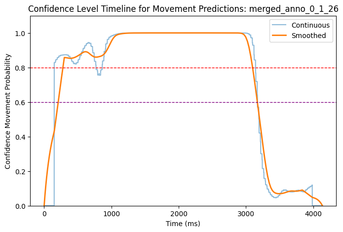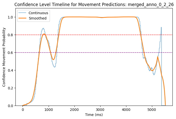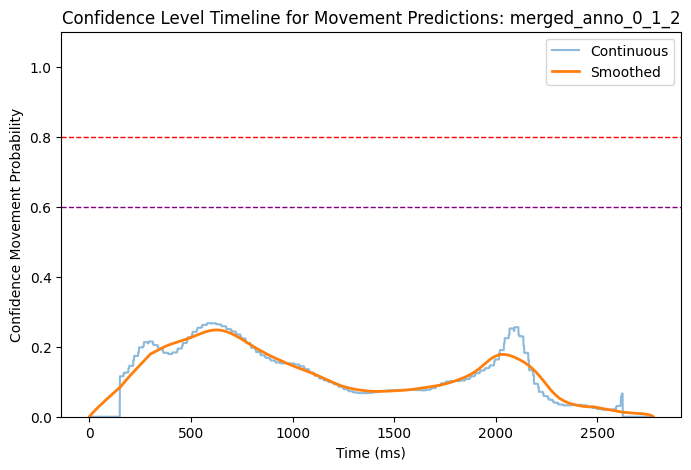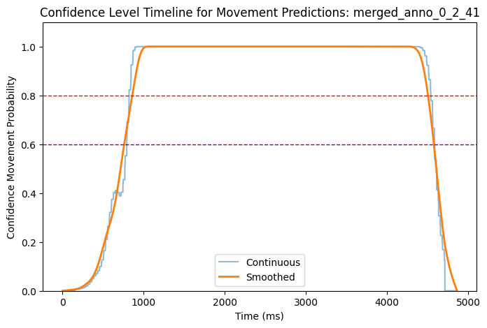 # Function to plot confidencedef plot_smooth_confidence_timeline(filename, folder_path):try:# Construct the full path to the file and load the data: file_path = os.path.join(folder_path, filename) filename = os.path.basename(file_path).split('_')[0:5]# Concatenate the first 5 elements of the filename to create a title filename ='_'.join(filename) timeline = pd.read_csv(file_path)# Plot the timeline: plt.figure(figsize=(8, 5)) plt.plot(timeline['time_ms'], timeline['confidence_movement'], label='Continuous', alpha=0.5) plt.plot(timeline['time_ms'], timeline['smoothed_confidence'], label='Smoothed', linewidth=2)# Add red horizontal line at y = 0.8 # Example threshold 1 plt.axhline(y=0.8, color='red', linestyle='--', linewidth=1)# Add purple horizontal line at y = 0.6 # Example threshold 2 plt.axhline(y=0.6, color='purple', linestyle='--', linewidth=1) plt.xlabel('Time (ms)') plt.ylabel('Confidence Movement Probability') plt.ylim(0, 1.1) # Set y-axis limits between 0 and 1.1 for better visualization plt.legend() plt.title(f'Confidence Level Timeline for Movement Predictions: {filename}') plt.show()exceptExceptionas e:print(f'Error processing file {filename}: {e}')