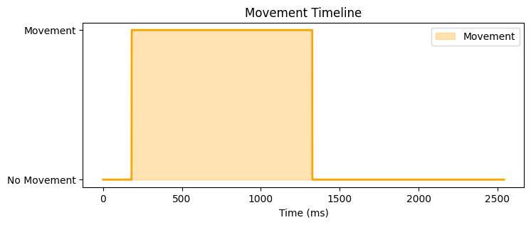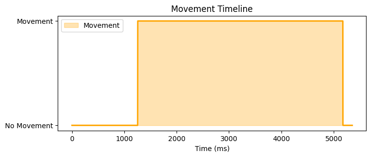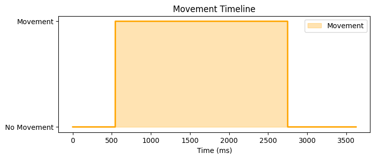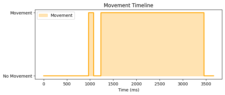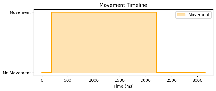 # Function to average the confidence values for each time point and create continuous confidence-timelinedef generate_continuous_timeline(df, max_time, segment_duration=100, shift=24):# Prepare a timeseries of a length equal to the trial duration timeline = np.arange(0, max_time +1) continuous_probabilities = []# A loop to calculate the average confidence level at each millisecond:for t in timeline:# Find the segments that overlap with this time point: overlapping_segments = df[(df['start_time'] <= t) & (df['start_time'] + segment_duration > t)]# Average the confidence levels of these overlapping segmentsifnot overlapping_segments.empty: avg_confidence = overlapping_segments['confidence_movement'].mean()else: avg_confidence = np.nan # If there is no data at this millisecond continuous_probabilities.append(avg_confidence)# Replace the first and last 150 ms of probabilities with zeros to avoid edge bumps (we know anyway there is always a no movement in the beginning and in the end) change_duration =150 continuous_probabilities[:change_duration] = [0] * change_duration continuous_probabilities[-change_duration:] = [0] * change_duration# Create a df for the continuous probability timeline continuous_timeline = pd.DataFrame({'time_ms': timeline, 'confidence_movement': continuous_probabilities})# Fill NaN values throughout using forward-fill (fill with last value) or backward-fill (fill with next value) continuous_timeline['confidence_movement'] = continuous_timeline['confidence_movement'].ffill().bfill()return continuous_timeline# Function to smooth the continuous timeline of confidence scores using a moving average with a fixed window sizedef smooth_timeline(continuous_timeline, window_size=300):# Applying smoothing with the specified window size (using ".rolling()" method from pandas)# "min_periods = 1": at least one value in the window should have a value.# "center = True": centers the window around the points. continuous_timeline['smoothed_confidence'] = continuous_timeline['confidence_movement'].rolling(window=window_size, min_periods=1, center=True).mean()return continuous_timeline
