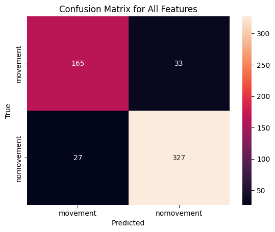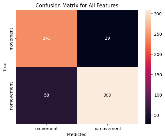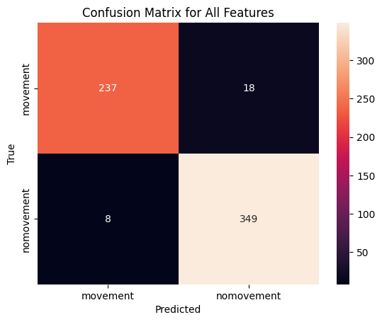 # Load head datacsv_path = trainingfolder +'dataset_head_mov_features.csv'# Create a MovementClassifier objectmodel_head = MovementClassifier(csv_path)# load in the modelmodel_path = modelsfolder +'model_head_mov.pkl'model_head = joblib.load(model_path)# Load featuresfeature_indices =list(range(model_head.df.shape[1] -3))# Load the feature and label dataX, y = model_head.load_and_process_data(X_columns=feature_indices, y_column='anno_value')# Evaluate and plot using the selected featuresmodel_head.evaluate_and_plot("All", X, y)# Save the modelmodel_path = modelsfolder +'model_head_mov.pkl'joblib.dump(model_head, model_path)