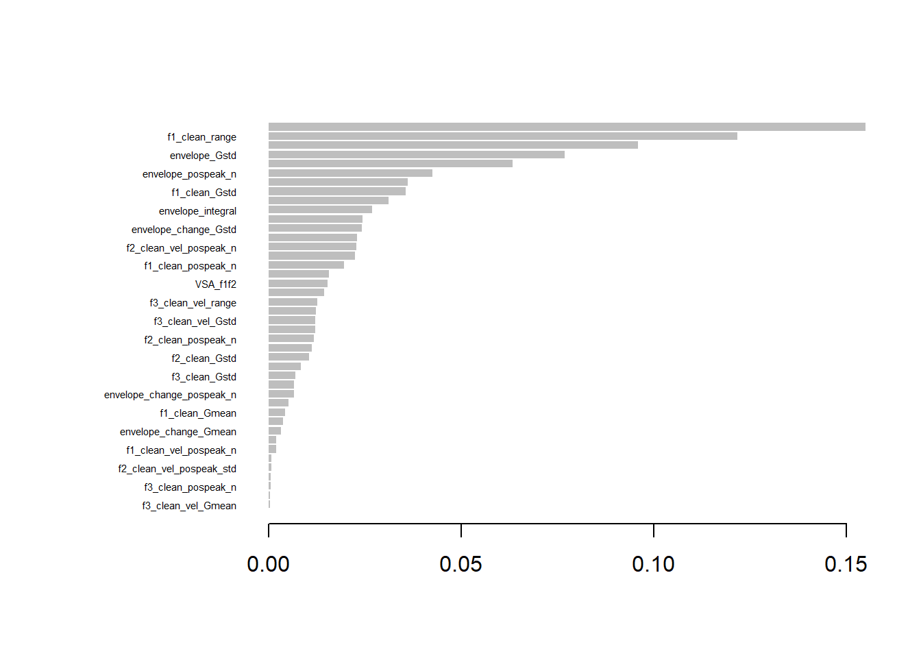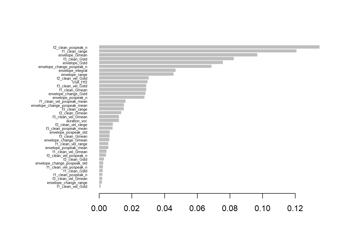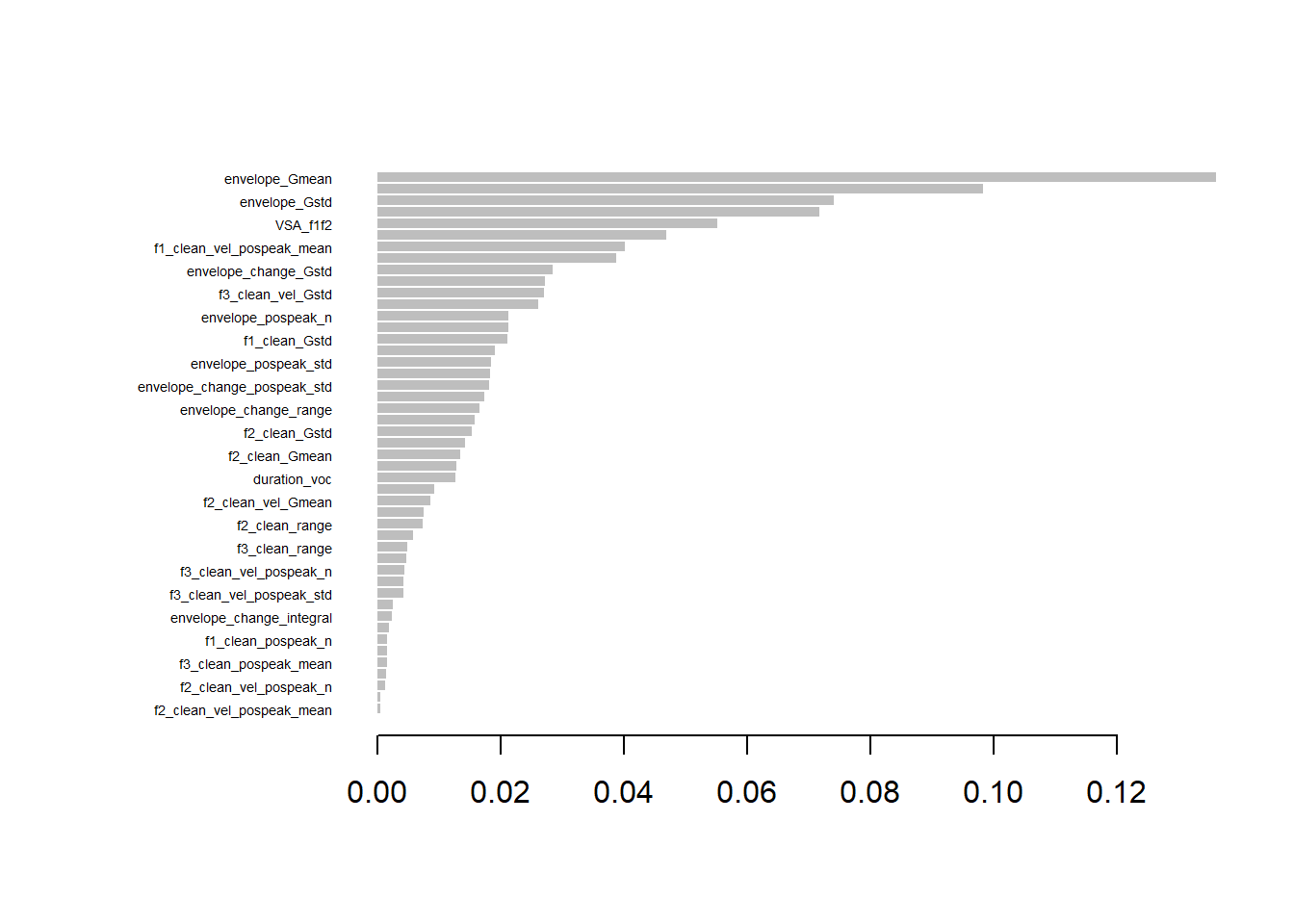 # Calculate feature importancefeature_importance <-importance(vocTuned, num.threads =1, type =1) # Convert to data framefeature_importance <-as.data.frame(feature_importance, stringsAsFactors =FALSE)feature_importance$Feature <-rownames(feature_importance)colnames(feature_importance) <-c("Importance", "Feature")# Sort by importancesorted_feature_importance <- feature_importance[order(-feature_importance$Importance), ]# Print sorted feature importancehead(sorted_feature_importance, n=10)