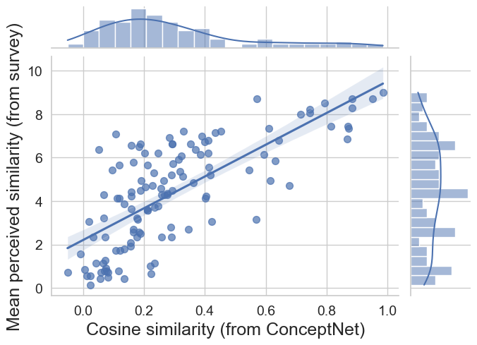 For each target-answer pair from the experiment, we have computed cosine similarity using the Dutch word embeddings in numberbatch version 19.08 from ConceptNet (Speer, Chin, and Havasi 2018). To validate this measure as a proxy of conceptual similarity, we have collected data from 14 Dutch-native people who were asked to rate the same pairs of words in an online study in terms of how similar they felt, and compare the rated and computed (cosine) similarity. Pearson’s r coefficient of .73 reveals a strong positive correlation.